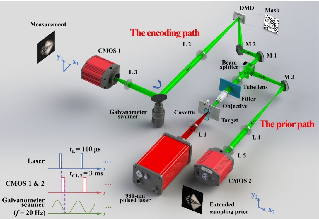 該系統(tǒng)采用脈沖激光作為激發(fā)光源,并通過數(shù)字微鏡器件(DMD)加載偽隨機圖案對動態(tài)場景進行空間編碼。動態(tài)場景的光信號被劃分為兩個路徑:在編碼路徑中,通過振鏡掃描將時間信息轉化為空間剪切偏移,并由CMOS相機捕獲;在先驗采樣路徑中,另一臺同步的CMOS相機直接采集場景的未編碼積分圖像。系統(tǒng)通過數(shù)字延遲