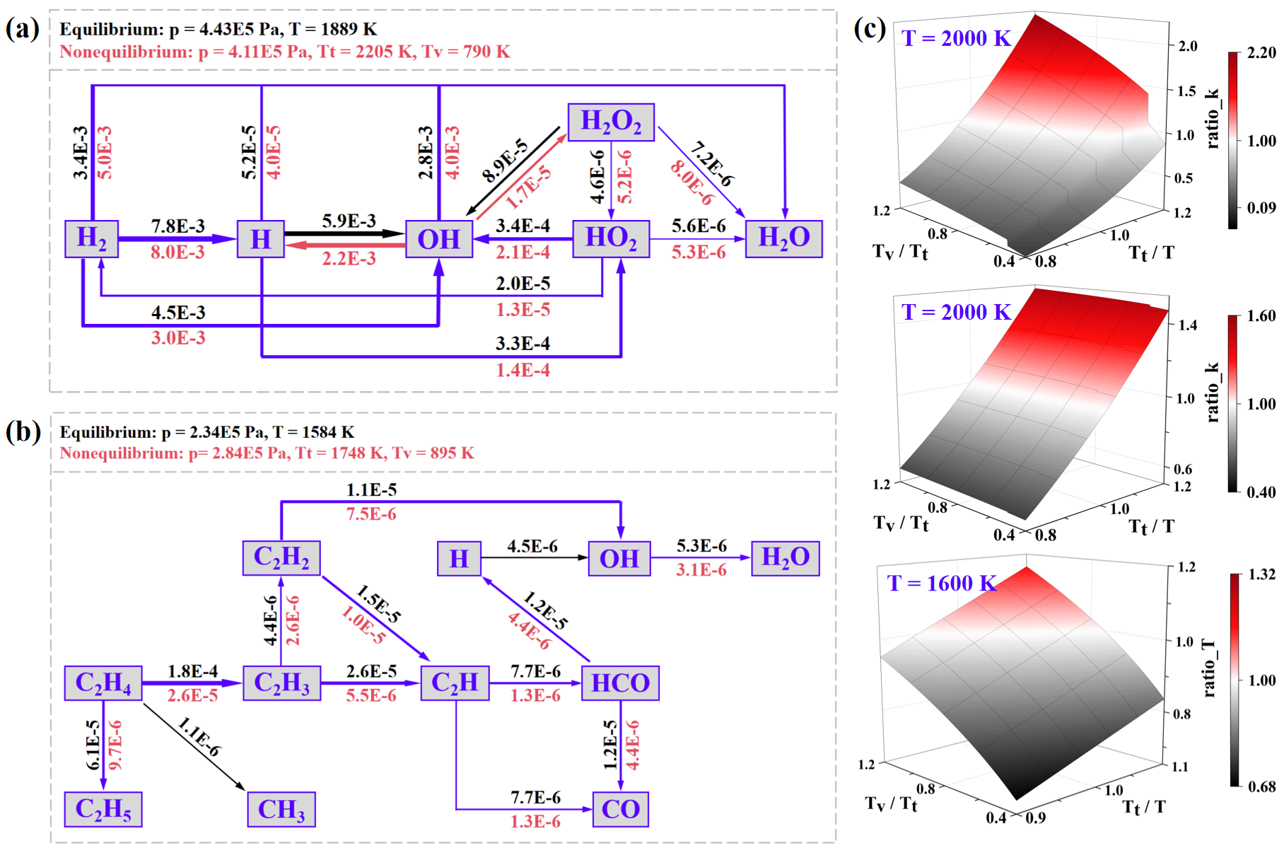 該工作取得突破性進(jìn)展如下。第一,該研究發(fā)展了Dynamic Zone Flamelet Model (DZFM)+Zonal Nonequilibrium Model(ZNM)超聲速湍流燃燒熱化學(xué)非平衡模型,相較于傳統(tǒng)模型,該模型計算效率提升了10倍以上,使得原來需要數(shù)年的計算量可在168小時內(nèi)完成。同時,相較于國內(nèi)外同行普遍少于1000萬網(wǎng)格量,該研究實現(xiàn)了超過億級網(wǎng)格(2.2億)的非平衡大規(guī)模模擬;第二,該研究詳細(xì)討論了氫和碳?xì)鋬深惏l(fā)動機熱化學(xué)非平衡規(guī)律。分析了在超燃沖壓發(fā)動機典型溫度區(qū)間內(nèi)不同程度的熱化學(xué)非平衡效應(yīng)對于不同類型基元反應(yīng)的影響。發(fā)現(xiàn)對于鏈?zhǔn)椒种Х磻?yīng)H+O2=OH+O的抑制和對于脫氫離解反應(yīng)的抑制分別主導(dǎo)氫燃料和乙烯燃料在非平衡條件下點火滯后,如圖1和2所示;第三,相關(guān)模擬技術(shù)有力支撐了國家某重大專項的型號設(shè)計,完成了60余工況的億級網(wǎng)格高保真計算分析,獲得了熱化學(xué)非平衡條件下燃燒效率更低、推力輸出更低的規(guī)律,校正了傳統(tǒng)基于熱化學(xué)非平衡假設(shè)開展的高馬赫發(fā)動機設(shè)計。