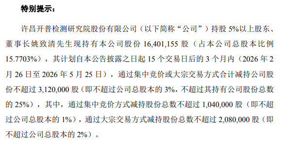 公告顯示,董事長姚致清先生現(xiàn)持有本公司股份16,401,155股(占本公司總股本比例15.7703%),其計劃自本公告披露之日起15個交易日后的3個月內(2026年2月26日至2026年5月25日),通過集中競價或大宗交易方式合計減持公司股份不超過3,120,000股(即不超過公司總股本的3%,不超過其持有公司股份總數(shù)的25%),其中,通過集中競價方式減持股份總數(shù)不超過1,040,000 股(即不超過公司總股本的1%),通過大宗交易方式減持股份總數(shù)不超過2,080,000股(即不超過公司總股本的2%)。