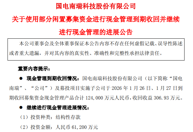 【儀表網(wǎng) 行業(yè)財(cái)報(bào)】1月27日晚間,國(guó)電南瑞(600406)公告,披露公司及募投項(xiàng)目實(shí)施子公司近期完成12.4億元閑置募集資金現(xiàn)金管理產(chǎn)品的到期收回,并使用部分閑置資金繼續(xù)進(jìn)行結(jié)構(gòu)性存款投資。