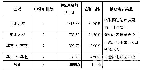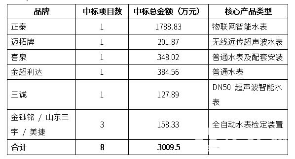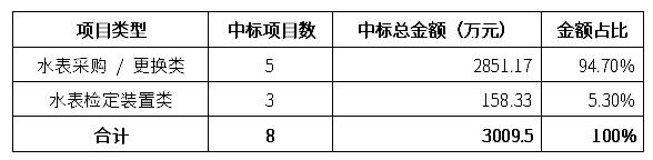本次統(tǒng)計(jì)的8個(gè)水表相關(guān)中標(biāo)項(xiàng)目總金額達(dá) 30,095,037元(約3009.50萬(wàn)元)。