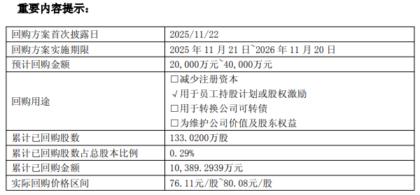自本次回購實施起始日至2026年1月31日,公司股份回購專用證券賬戶通過集中競價交易方式已回購公司股份數(shù)量為1,330,200股,已回購股份占公司總股本的比例為0.29%,購買的最高價為80.08元/股,最低價為76.11元/股,已支付的總金額為10,389.2939萬元(含交易費用)。上述回購進展符合法律法規(guī)的規(guī)定和公司回購股份方案的要求。