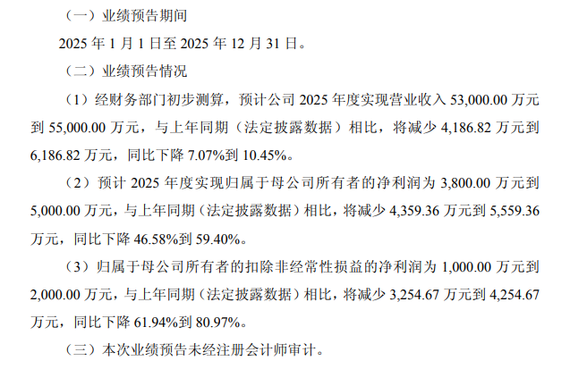 摘要預(yù)計2025年實現(xiàn)營業(yè)收入5.3億元至5.5億元,同比下降7.07%-10.45%;歸母凈利潤3800萬元至5000萬元,同比下降46.58%-59.40%;扣非凈利潤預(yù)計1000萬元-2000萬元,同比下降61.94%-80.97%。