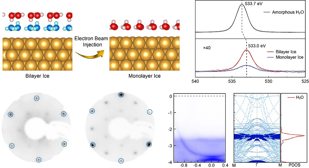 圖:在疏水性金屬表面實現(xiàn)單層冰。結(jié)構(gòu)模型、XPS、LEED、ARPES和理論計算數(shù)據(jù)。