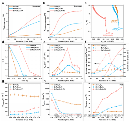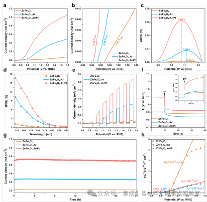 如圖3所示,對(duì)表面改性的ZnFe2O4光陽(yáng)極進(jìn)行光電化學(xué)性能測(cè)試,相較于原始未優(yōu)化的樣品,基于Pt單原子/氧空位工程協(xié)同調(diào)控的鐵酸鋅光陽(yáng)極器件在1.23 VRHE的光電流密度從0.02 mA/cm2增強(qiáng)至0.7 mA/cm2,實(shí)現(xiàn)了35倍的性能增強(qiáng)。同時(shí),光電壓等關(guān)鍵性能參數(shù)均得到同步優(yōu)化,表明表面工程策略對(duì)器件整體光電化學(xué)性能具有系統(tǒng)性增強(qiáng)作用。