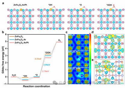 如圖6所示,進(jìn)一步利用密度泛函理論(DFT)計(jì)算,從原子與電子尺度系統(tǒng)揭示了單原子Pt與氧空位協(xié)同改性對(duì)ZnFe2O4光陽(yáng)極表面水氧化催化活性的增強(qiáng)機(jī)制。計(jì)算結(jié)果表明,該協(xié)同策略可優(yōu)化表面局域電子結(jié)構(gòu)、降低反應(yīng)能壘,從而顯著提升光電化學(xué)分解水的本征活性。