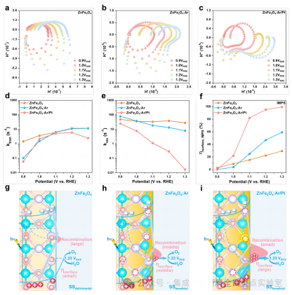 如圖4-5所示,多項(xiàng)原位譜學(xué)表征共同揭示ZnFe2O4光電極性能的大幅提升主要源于表面電荷轉(zhuǎn)移效率的根本性改善。其中,表面態(tài)作為主導(dǎo)性的半導(dǎo)體界面電荷行為調(diào)控中心,深刻影響著載流子的分離、捕獲與輸運(yùn)動(dòng)力學(xué)。為進(jìn)一步揭示其微觀機(jī)制,研究進(jìn)一步綜合聯(lián)用光電化學(xué)阻抗譜(PEIS)與強(qiáng)度調(diào)制光電流譜(IMPS)等表征技術(shù),結(jié)合等效電路擬合,系統(tǒng)獲得了ZnFe2O4光陽(yáng)極的表面態(tài)電子結(jié)構(gòu)及對(duì)應(yīng)的載流子轉(zhuǎn)移阻抗數(shù)據(jù)。結(jié)果表明,通過(guò)單原子Pt與氧空位的協(xié)同作用,成功實(shí)現(xiàn)了表面態(tài)重構(gòu),使其從原有的不利復(fù)合中心轉(zhuǎn)變?yōu)楦咝У妮d流子傳輸通道,顯著抑制了界面復(fù)合損失,從而有效提升了器件的表面載流子轉(zhuǎn)移效率。在此基礎(chǔ)上,研究明確了表面態(tài)電子結(jié)構(gòu)與ZnFe2O4光電化學(xué)器件性能之間的內(nèi)在構(gòu)效關(guān)系,為面向高性能的半導(dǎo)體界面工程的理性設(shè)計(jì)提供了機(jī)制依據(jù)。