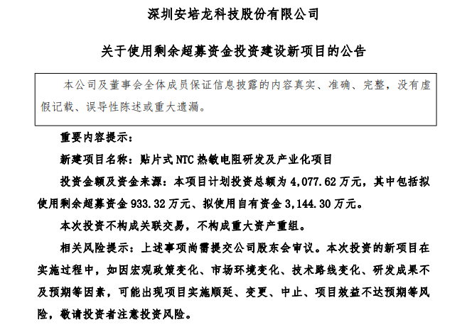 儀表網(wǎng) 企業(yè)動(dòng)態(tài)】1月29日,安培龍(301413)公告,安培龍于2026年1月28日召開了第四屆董事會(huì)第十三次會(huì)議,審議通過了《關(guān)于使用剩余超募資金投資建設(shè)新項(xiàng)目的議案》。結(jié)合當(dāng)前募集資金投資項(xiàng)目(以下簡稱“募投項(xiàng)目”或“本項(xiàng)目”)實(shí)際進(jìn)展情況,公司擬計(jì)劃投資總額為4,077.62萬元建設(shè)“貼片式NTC熱敏電阻研發(fā)及產(chǎn)業(yè)化項(xiàng)目”(其中包括使用剩余超募資金933.32萬元,使用自有資金3,144.30萬元),以實(shí)現(xiàn)貼片式 NTC 熱敏電阻的產(chǎn)業(yè)化,將進(jìn)一步擴(kuò)大