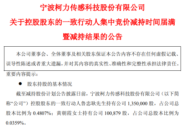 柯力傳感控股股東一致行動(dòng)人減持落幕