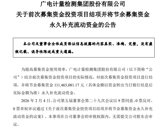 廣電計量表示,本次使用前次節(jié)余募集資金永久補充流動資金,有利于滿足公司業(yè)務(wù)發(fā)展對流動資金的需求,提高資金使用效率,降低財務(wù)成本,符合公司及全體股東的利益。