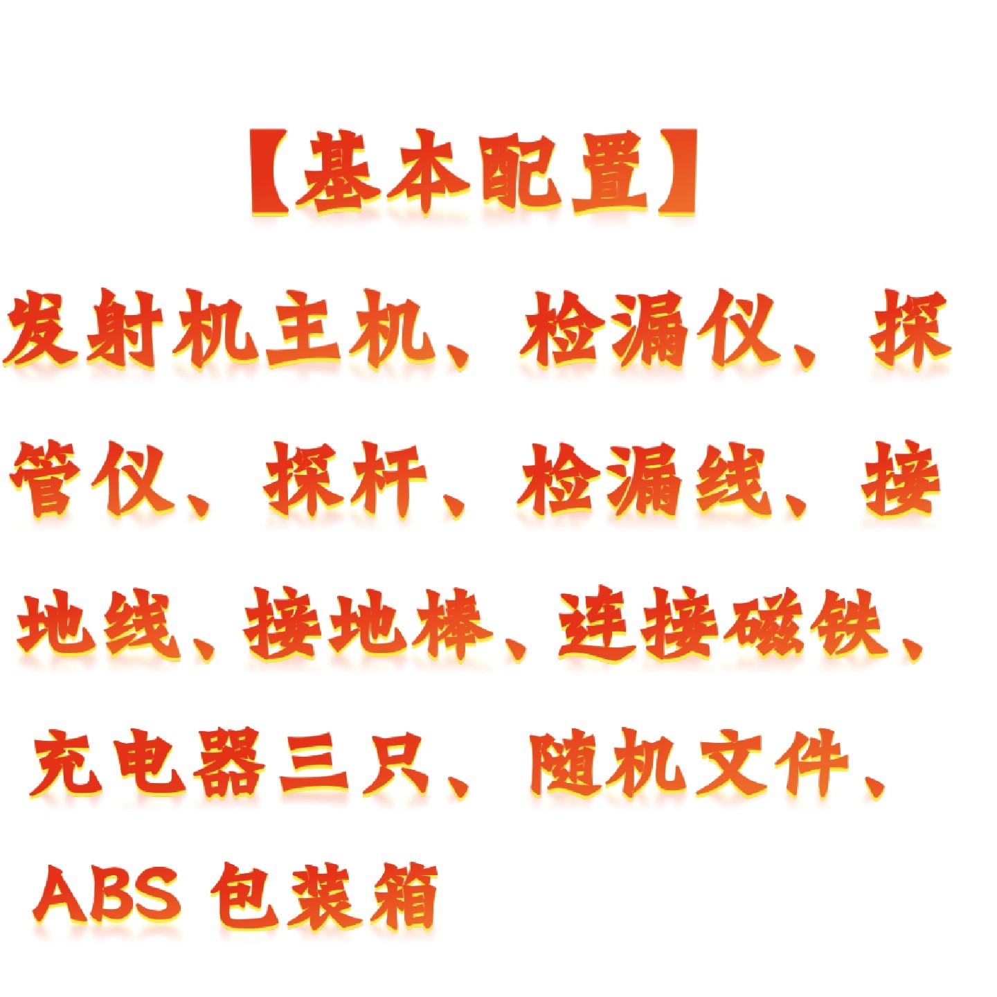發(fā)射機(jī)主機(jī)、檢漏儀、探管儀、探桿、檢漏線、接地線、接地棒、連接磁鐵、充電器三只、隨機(jī)文件、ABS包裝箱
